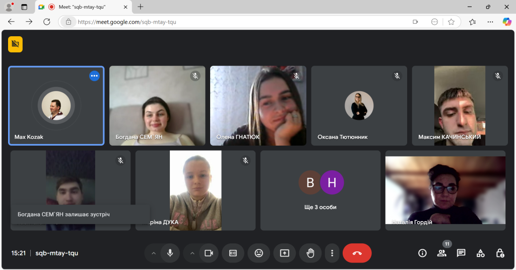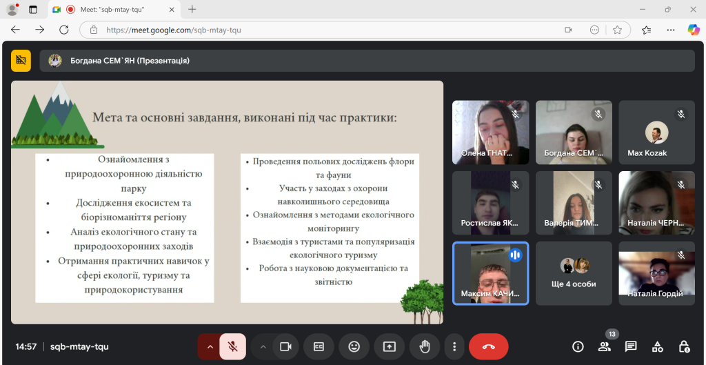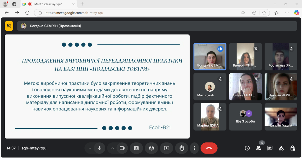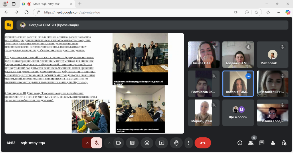 24 лютого 2025 р. відбувся захист практики. Члени комісії: КОЗАК М.І., к.б.н, доцент кафедри біології та екології – голова комісії; ГОРДІЙ Н.М., к.б.н., доцент, старший викладач кафедри біології та екології; ТЮТЮННИК О.С., к.с.г.н., старший викладач кафедри біології та екології, секретар комісії СОСЮК Н.В.