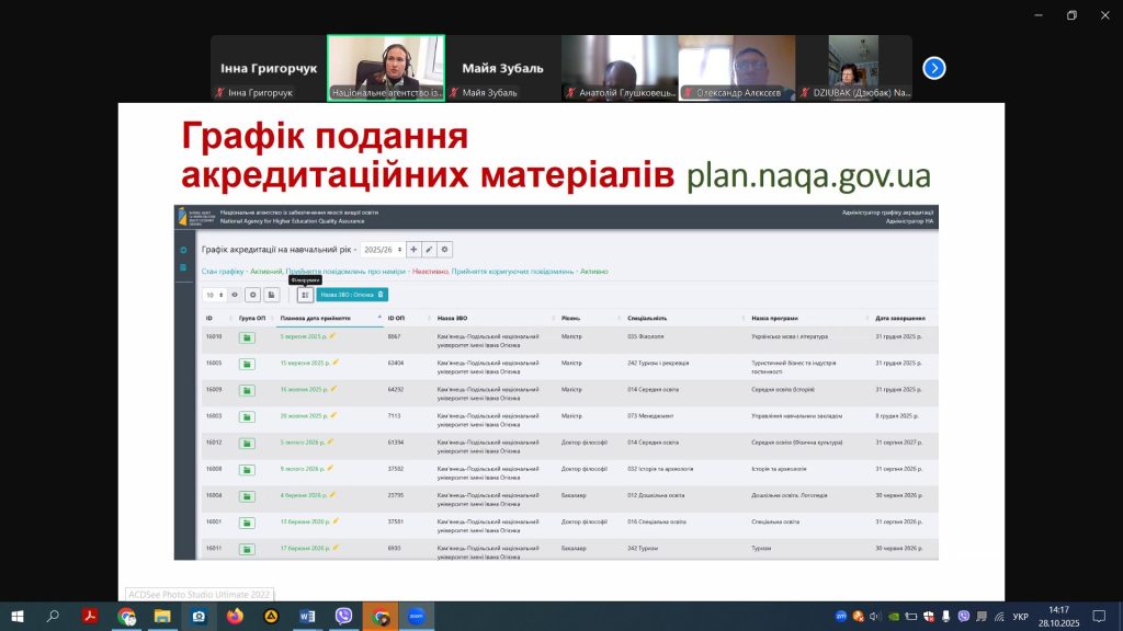Під час заходу учасники обговорили ключові етапи підготовки матеріалів до акредитації, особливості формування звітів про самооцінювання та критерії, за якими Національне агентство ухвалює рішення.
