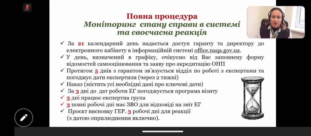 Спікером заходу виступила Ганна Денискіна, керівник відділу акредитації освітніх програм Національного агентства із забезпечення якості вищої освіти. Семінар проходив в онлайн-форматі та розпочався о 14:00.