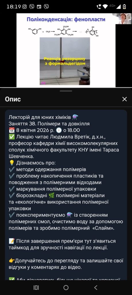 Асистент кафедри біології та екології Андрусяк Д.В. та здобувачі вищої освіти долучилися до науково-популярної онлайн-лекції «Полімери та довкілля», яка відбулася 8 квітня 2026 року на ютуб-каналі хімічного факультету.
