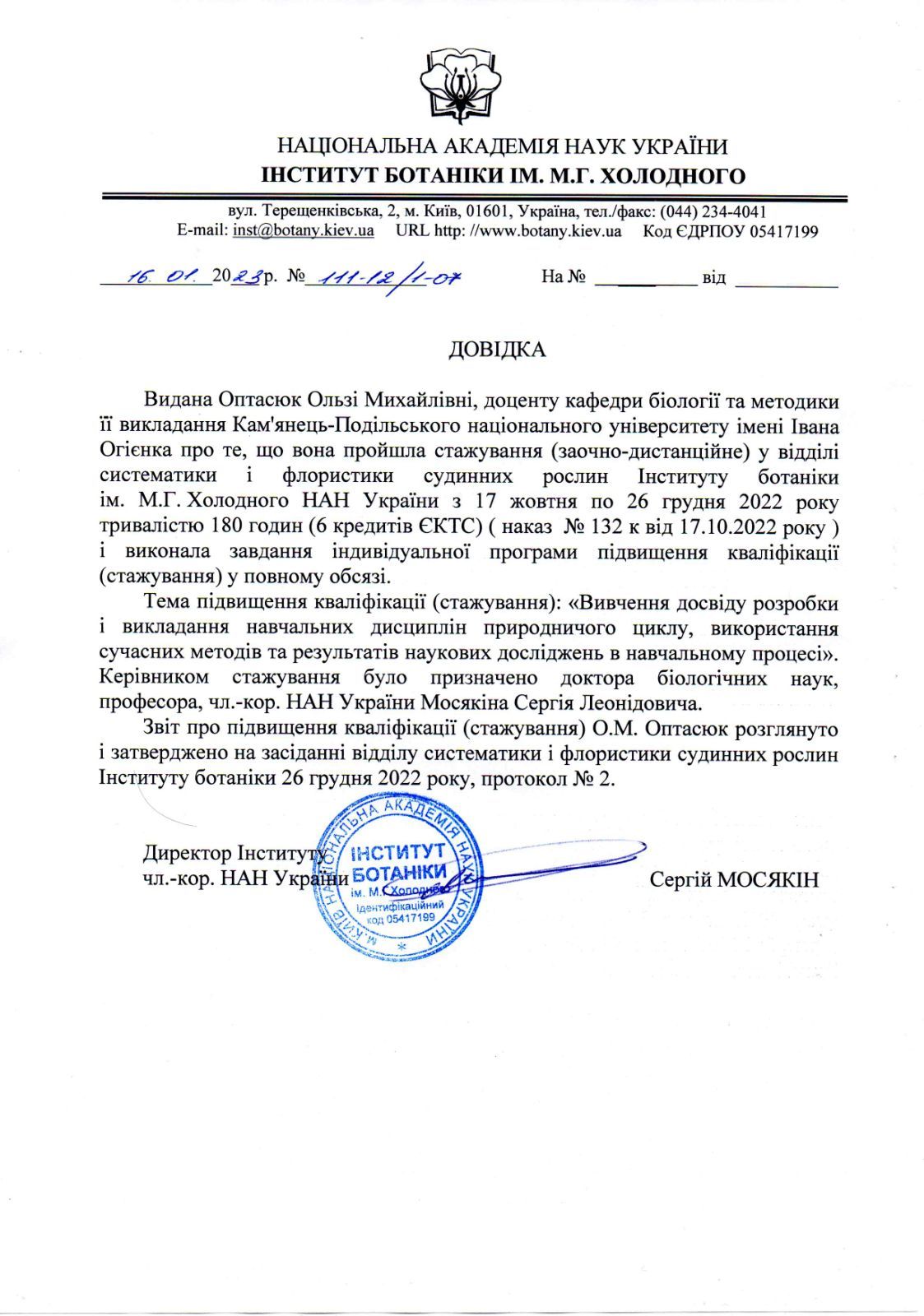 Навчальні дисципліни: «Ботаніка», «Систематика вищих рослин», «Альгологія і мікологія», «Основи флористики та флора України», «Біологічна номенклатура», «Радіобіологія», «Антропогенна трансформація рослинного покриву», «Інструментальні методи досліджень в біології та медицині», «Сучасні експериментальні методи досліджень у біології».