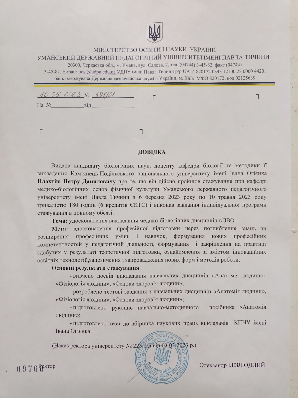 | Удосконалення викладання методико-ьіологічних дисциплін в ЗВО. 180 годин. 2023 |