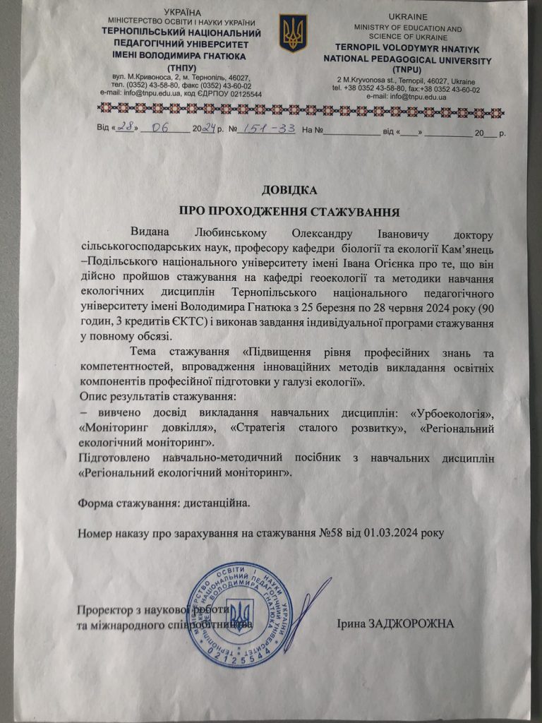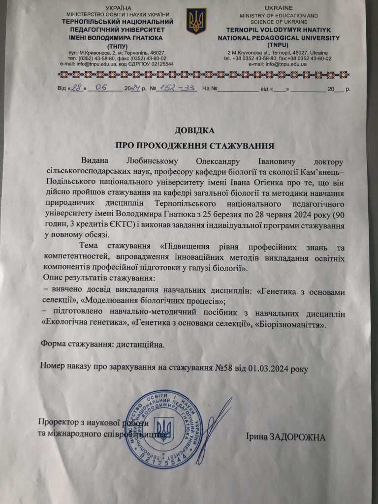 - Любинський О.І., доктор сільськогосподарських наук, професор, професор кафедри біології та екології